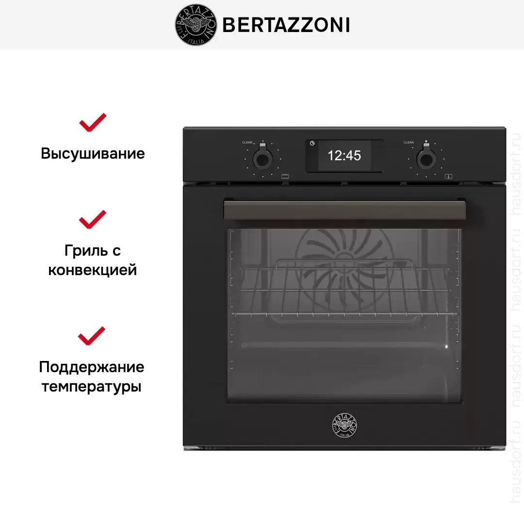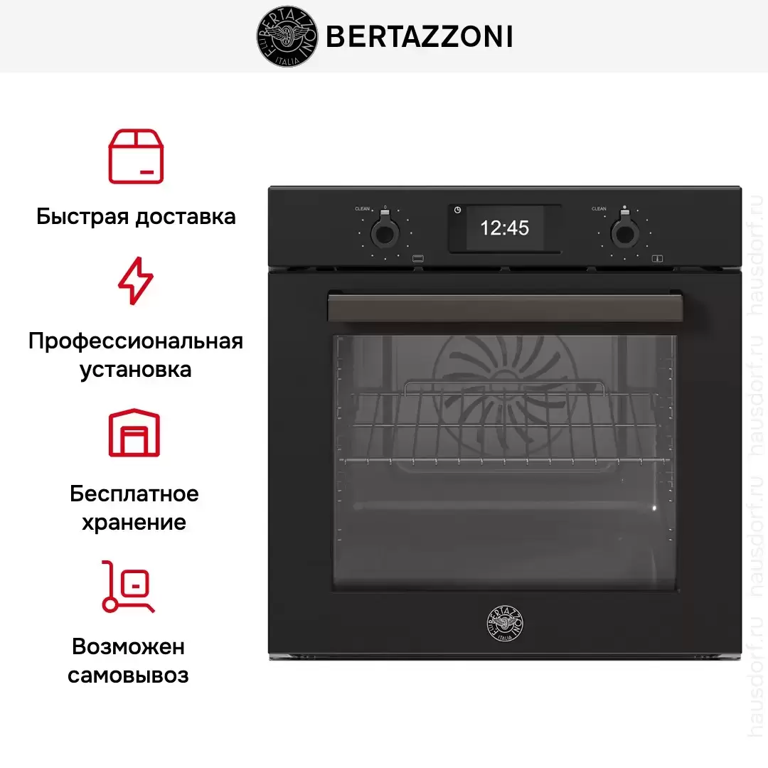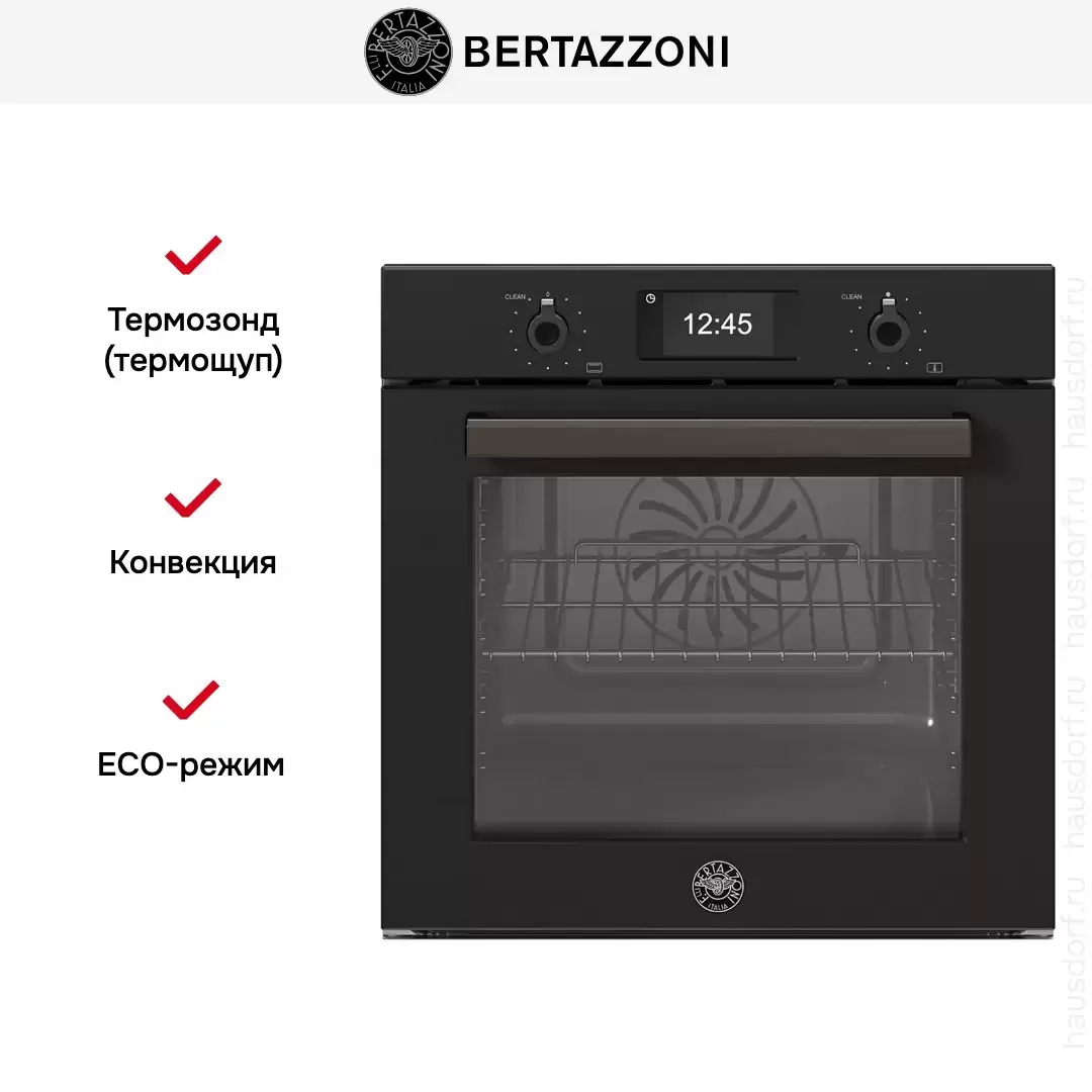 Духовой шкаф Bertazzoni F6011PROVPTN-23 — независимая электрическая модель в профессиональном оформлении, выполненная в строгом черном цвете и рассчитанная на встраивание в стандартную нишу. Размеры изделия 59.7×59.5×57.3 см, а рекомендуемая ниша для монтажа 58—58.5×56—57×56—58 см, что упрощает подбор мебели и установку. Высокий объём камеры 76 литров позволяет готовить крупные блюда и размещать до пяти уровней одновременно.