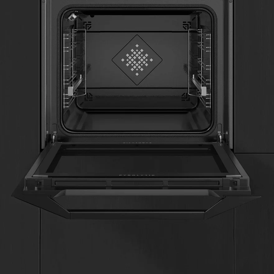 Управление сенсорное с поворотными регуляторами и LCD-дисплеем, есть электронные часы и таймер на 60 минут. Функции предварительного выбора температуры, интеллектуальный датчик AI и опции завершения готовки повышают удобство и точность. Для безопасности предусмотрена защита от детей, а также опция шаббат для особых сценариев использования. Пиролитическая очистка и эмалированная камера позволяют удалять жировые отложения без усилий, а перфорированные и стальные противни в комплекте подходят для разных техник.