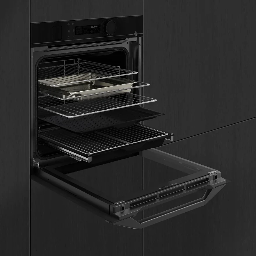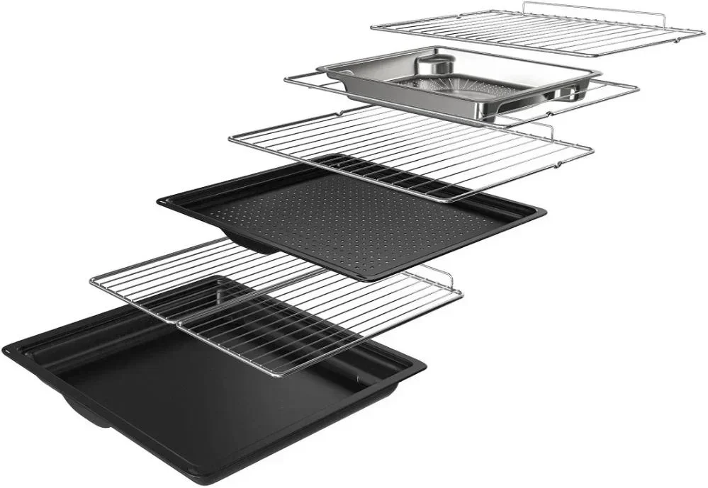 Комплектация включает телескопические направляющие полного выдвижения, две решетки, глубокий и перфорированный противень, а также две полурешетки. Галогенное освещение обеспечивает яркий и четкий обзор, а навесные направляющие на шести уровнях дают гибкость при расстановке аксессуаров. Низкое энергопотребление при классическом и вентиляторном нагреве делает прибор экономичным в долгосрочном использовании. Этот духовной прибор подходит как для семейных ужинов, так и для гастрономических экспериментов; он объединяет премиальный дизайн, набор профессиональных функций и простоту повседневного использования.