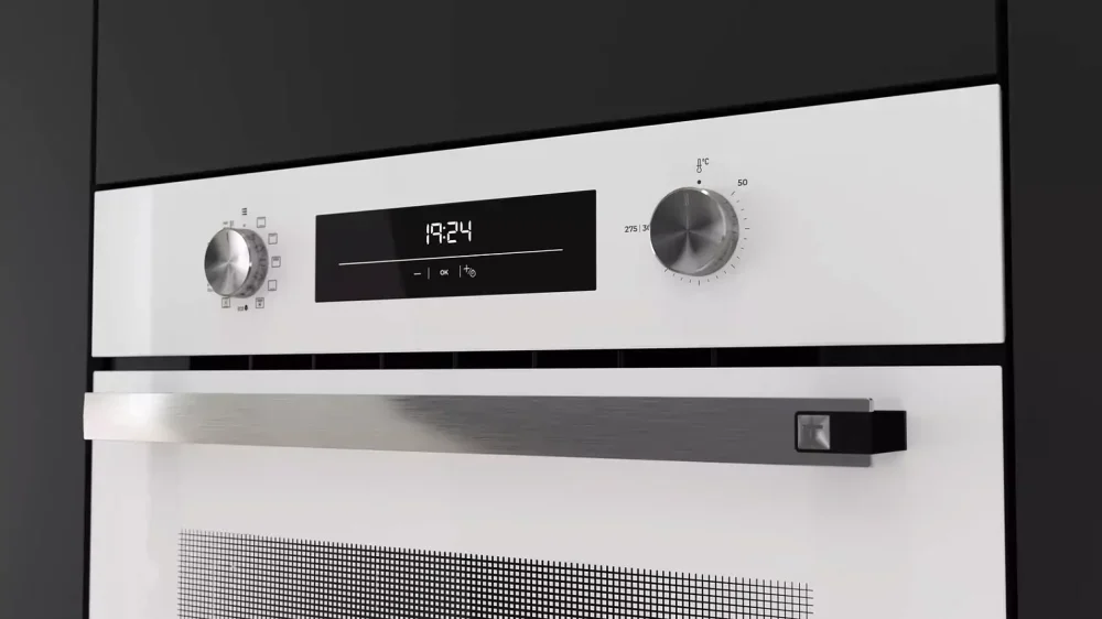 Особенности дизайна и внешней панели управления — также важный пункт при выборе духовки на кухню. В данной модели нужно обратить внимание на цвет — белый,