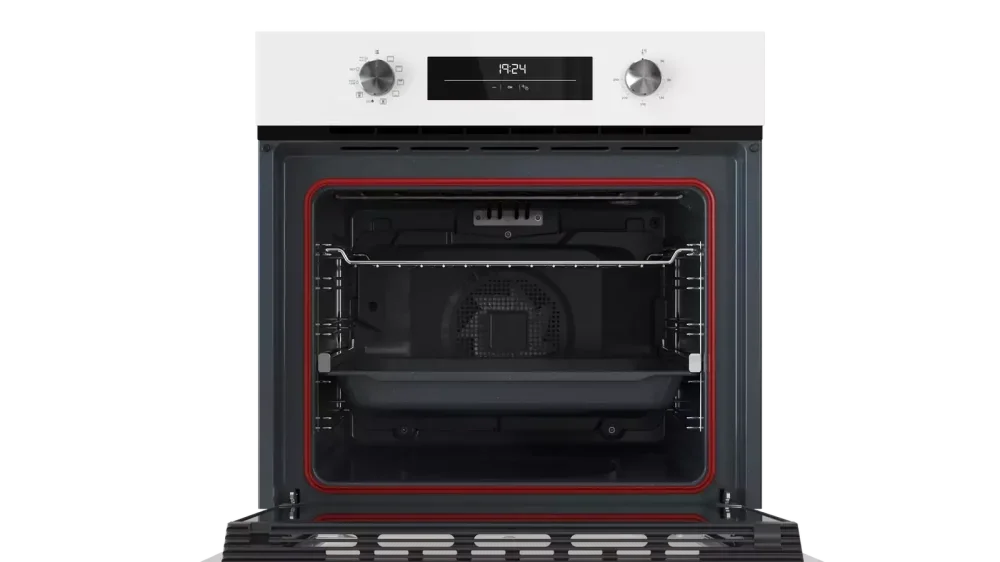 Особенности дизайна и внешней панели управления — также важный пункт при выборе духовки на кухню. В данной модели нужно обратить внимание на цвет — белый,