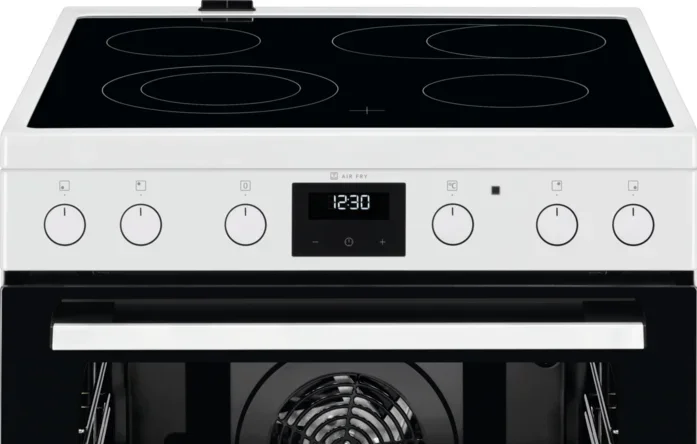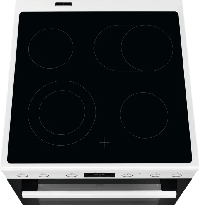 Верхняя панель выполнена из прочного стеклокерамического покрытия, удобного в уходе и устойчивого к высокому нагреву. Четыре электрические конфорки дают гибкость при приготовлении блюд разного размера. Одна конфорка имеет двойную корону, а одна — овальную зону расширения, что позволяет использовать и маленькие, и крупные кастрюли. Мощности зон варьируются от 1.2 до 2.2 кВт, диаметры конфорок — от 140 до 265 мм, а девять уровней мощности дают точную регулировку нагрева.