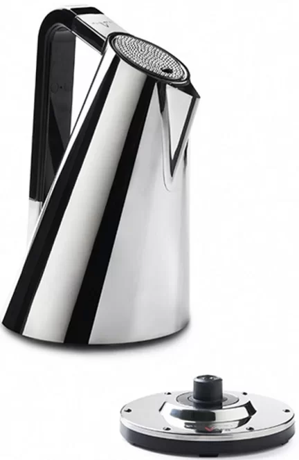 Чайник Bugatti хромового цвета с кристаллами Swarovski  на индикаторе. Элегантный чайник конической формы с интеллектуальной системой регулировки температуры нагрева и программируемым таймером. На ручке расположены кнопка управления и электронный индикатор. Благодаря дисковому нагревателю можно подогреть любое, даже небольшое количество воды.