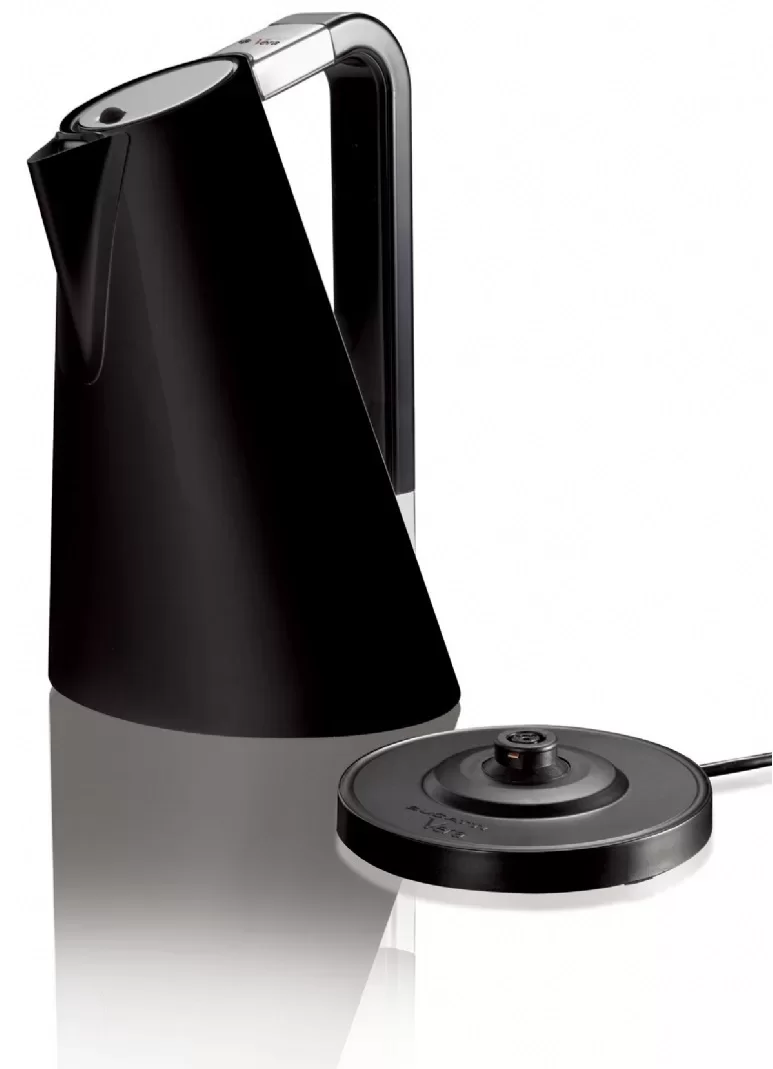 Электрический чайник от Bugatti в элегантном черном цвете. Модель с удобной подставкой с центральным контактом — вы можете поворачивать чайник на 360 градусов и ставить на базу из любого положения.
