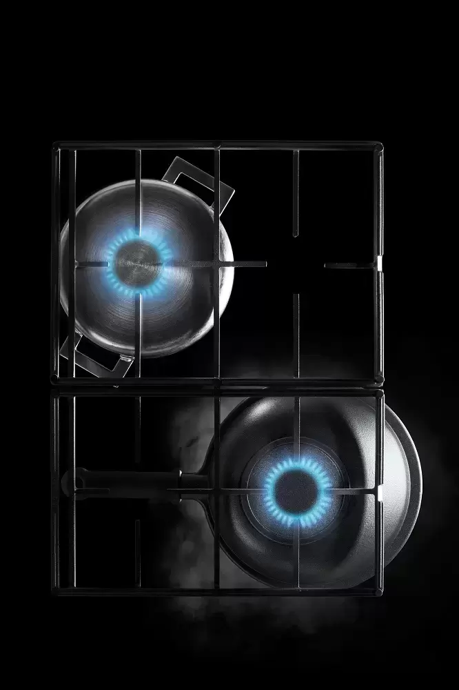 Во втором ряду располагаются две конфорки «Шеф» мощностью 3,5 кВт с двумя рядами пламени, которое равномерно нагревает дно посуды. В первом ряду находятся быстрая конфорка мощностью 3 кВт, а также стандартная и вспомогательная конфорки. Для включения их используется электроподжиг. Для предотвращения утечки газа служит надежная система «газ-контроль».