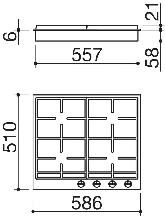 Во втором ряду располагаются две конфорки «Шеф» с двумя рядами пламени, которое направлено к центру для равномерного нагрева дна посуды. В первом ряду находятся стандартная и вспомогательная конфорки: все они оснащены электроподжигом и системой «газ-контроль» для предотвращения утечки газа. Механическая панель управления с поворотными переключателями служит для бесступенчатой регулировки мощности.
