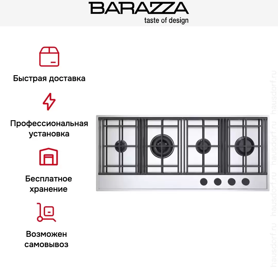 Газовая варочная панель Barazza 1PLE3D шириной 116 см отличается расположением конфорок в линию и может быть размещена на кухонном острове. Модель входит в дизайн-коллекцию LAB, она изготовлена из толстой нержавеющей стали AISI 304 с атласной поверхностью. Еще одна ее особенность — встраивание вровень со столешницей. Посуда удобно размещается на прочной решетке из чугуна.