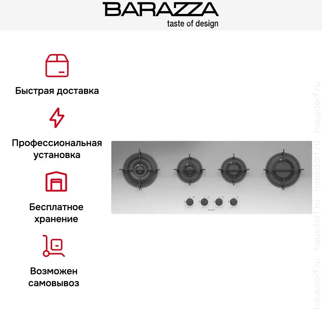 Независимая газовая варочная панель Barazza 1PMD104 шириной 110 см с четырьмя конфорками, расположенными в одну линию, относится к дизайн-коллекции MOOD. Поверхность изготовлена из матовой нержавеющей стали AISI увеличенной толщины 304 мм и может устанавливаться над столешницей. Раздельные чугунные решетки для каждой конфорки позволяют разместить посуду любого размера. Варочная панель имеет возможность подключения к газу в баллонах.