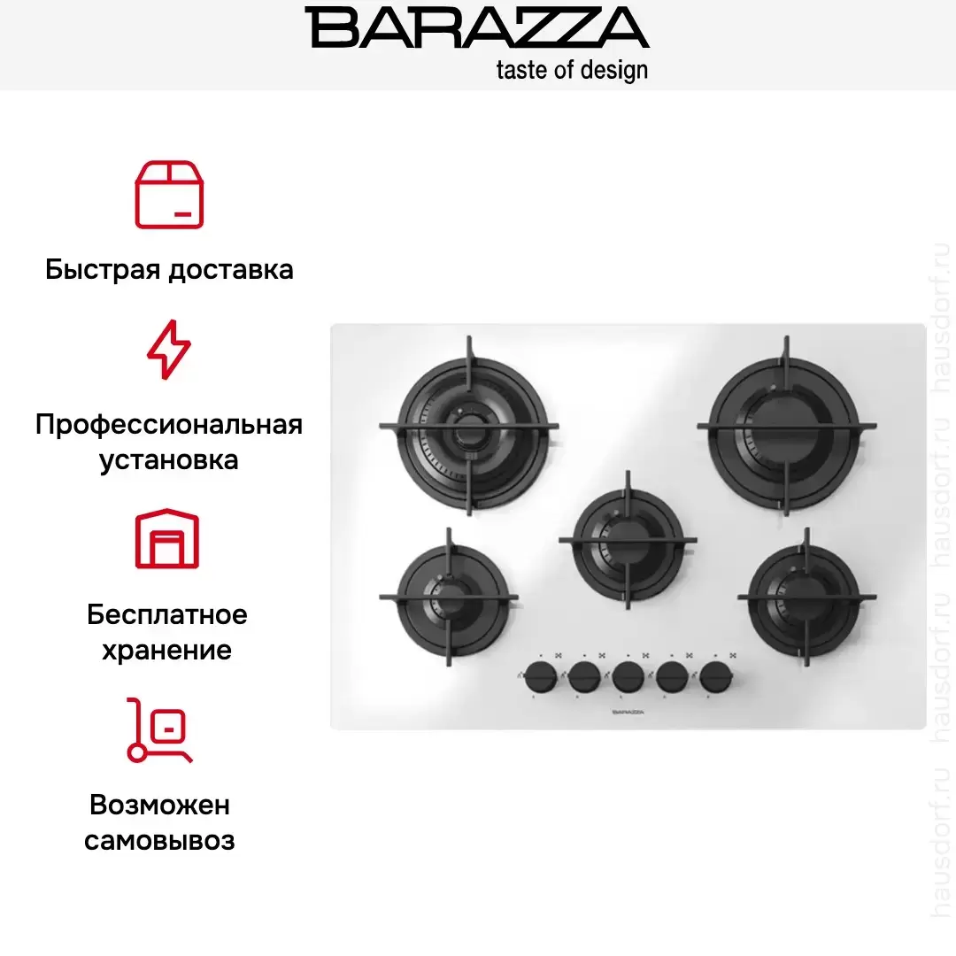 Модель Barazza выполнена из белой стеклокерамики и прекрасно впишется в светлую изящную кухню. Лаконичный дизайн поддерживается оригинальными чугунными держателями для посуды, которые представляют собой не полноценные массивные решетки, а несколько ограничителей непосредственно над горелками. При этом они также выдерживают большой вес наполненных кастрюль и сковород и не позволяют пламени выходить за пределы. Безопасности способствует и особый плоский дизайн крышек.