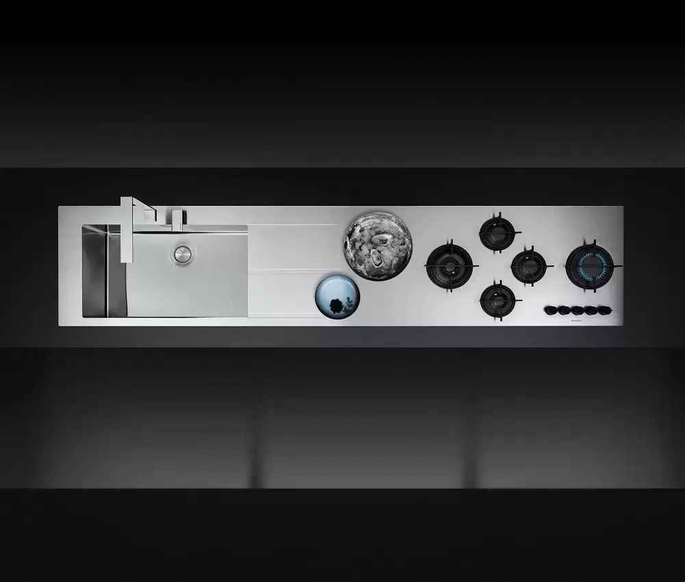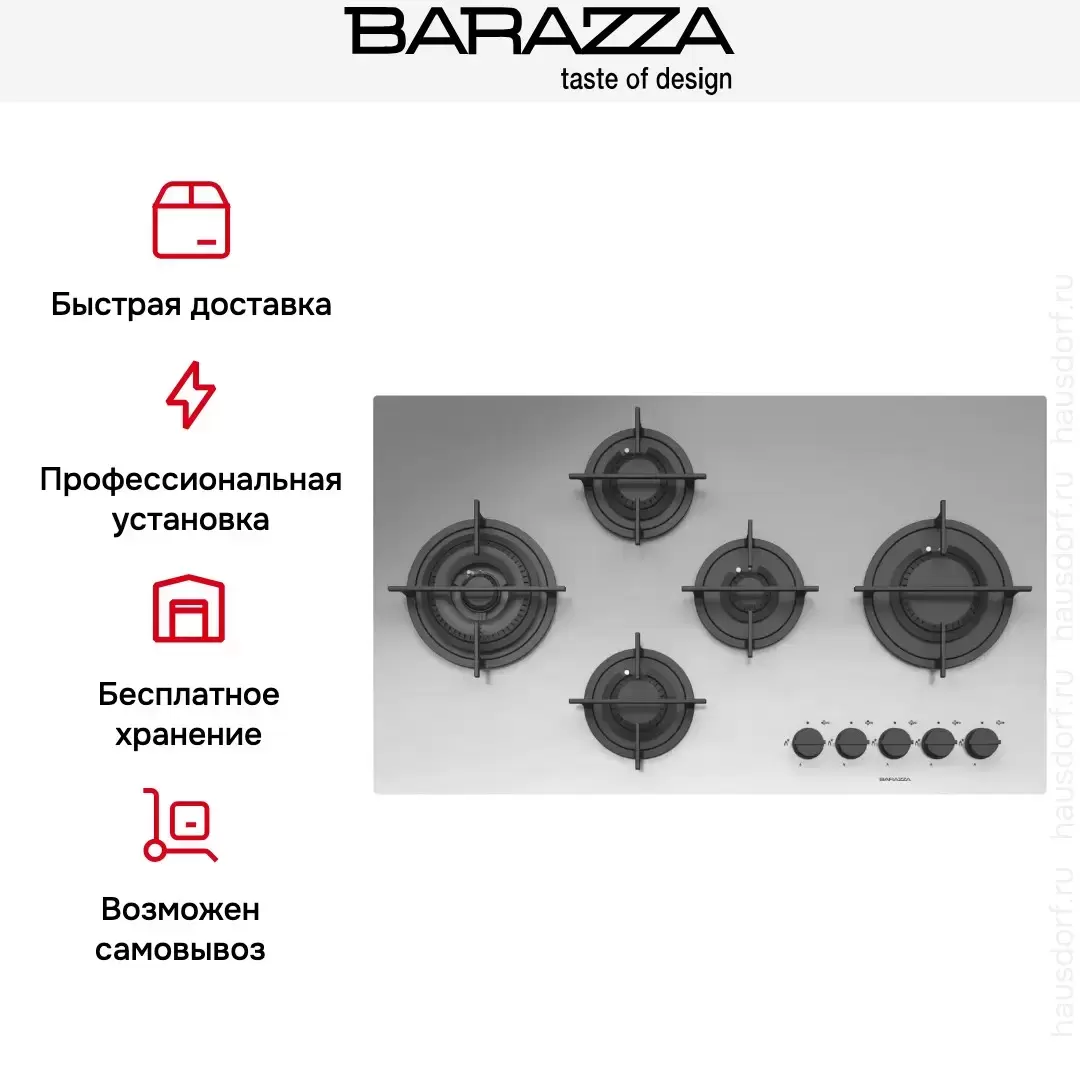 Газовая варочная панель Barazza 1PMD95 шириной 86 см из дизайн-коллекции MOOD привлекает оригинальным расположением конфорок: одна из них, скоростная конфорка мощностью 3 кВт, находится слева, а справа в виде ромба располагаются еще четыре конфорки, в том числе «Двойная корона» с двумя контурами пламени. Поверхность изготовлена из нержавеющей стали AISI увеличенной толщины 304 мм с матовой поверхностью. В комплект входят форсунки для подключения к баллонному газу. Для устойчивого размещения посуды служит раздельная чугунная решетка.
