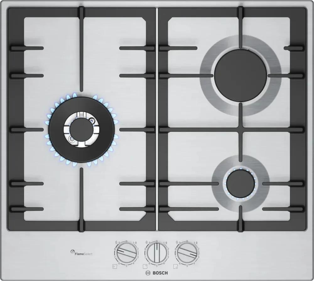 Выбор газовой варочной панели чаще всего обусловлен тем, что в частный дом или квартиру проведен именно газ в качестве обогрева. Работать с этой моделью довольно просто, так как мощность нагрева видна невооруженным взглядом — по силе огня в горелке. Количество конфорок в этой модели: 3.