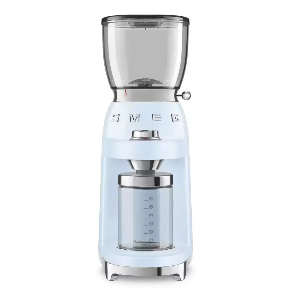 Smeg CGF01PBEU — оригинальная и практичная кофемолка из фирменной серии в стиле 50-х годов 20 века. Модель сочетает в себе классические черты ретро-дизайна: плавный силуэт и нежно-голубая окраска корпуса. Такое решение гармонично впишется в интерьер, выполненный как в современном, так и в традиционном стиле.