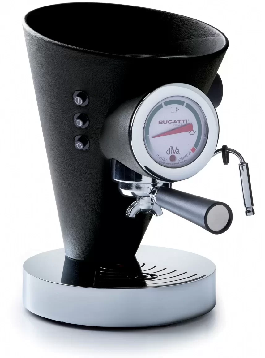 Эспрессо-машина покрытая черной кожей. Модель позволяет приготовить кофе в капсулах, молотый на 1 или 2 чашки. Время фильтрации кофе составляет всего 25 секунд.