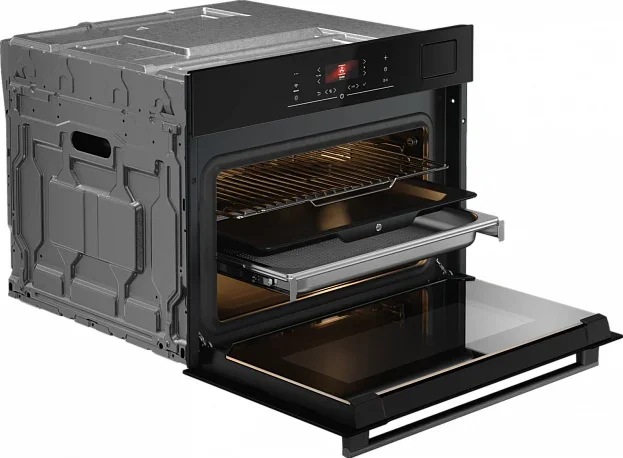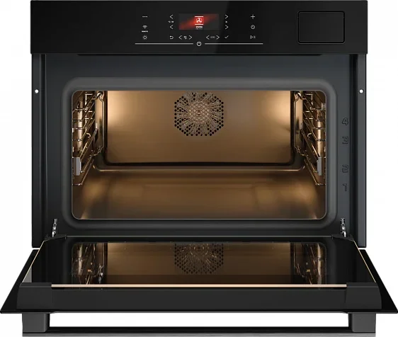 Компактный духовой шкаф ASKO OCS24BGH представляет собой продуманный в деталях прибор для современной кухни, где важны стиль, функциональность и точность. Его лаконичный корпус в чёрном стекле серии Essence гармонично вписывается в интерьер, занимая минимальную высоту 45.8 см при стандартной ширине 59.4 см и глубине 56.4 см, что делает устройство идеальным выбором для встраивания в нишу 45—45.5×56×55 см. Вместительная камера объёмом 51 литр оборудована зеркальным пиролитическим покрытием, обеспечивающим долговечность и простую паровую очистку, а галогенное освещение гарантирует равномерную подсветку уровня приготовления на трёх позициях. Сенсорная панель управления с цветным TFT-дисплеем даёт быстрый доступ к 14 режимам работы и 123 автоматическим программам, позволяя точно выбирать сочетания верхнего/нижнего нагрева, конвекции, электрического гриля с большой зоной нагрева и специализированных процедур с паром, включая три уровня интенсивности: интенсивный, нормальный и малый пар. Среди опций — поддержание блюд в тёплом состоянии, поднятие теста, размораживание, подогрев посуды, функция SousVide и уникальная технология Celsius°Cooking с калибровкой температуры для идеальных результатов при щадящем тепловом воздействии; диапазон регулирования распространяется от 30 до 250 °C. Встроенный резервуар ёмкостью 1.2 л обеспечивает автономную работу паровых циклов, а комплектация включает универсальную и стальную противни (перфорированные и неперфорированные), термощуп и одномерные телескопические направляющие для одного уровня, при этом внутри предусмотрены три уровня для гибкой организации пространства. Дверца откидного типа с четырьмя стеклами и технологией UltraCoolDoorQuadro+ остаётся холодной снаружи, что повышает безопасность, а комбинированные режимы с вентилятором, нижним нагревом и паром расширяют возможности для консервирования, высушивания и многоступенчатого приготовления: например, сочетания нижний нагрев + гриль + вентилятор или режимы с большим грилем и паровой подачей. Удобство работы дополняет подключение по электрической сети 220-240 В и встроенная поддержка приложения ConnectLife.TRIR для управления и обновления профилей, а также функции быстрого разогрева, 100% паровой цикл, экономичный ECO-режим, аэрогриль/аэрофритюр и опция 360°AirFlow для равномерного распределения потоков. При весе 34.5 кг и классе энергоэффективности A++ прибор сочетает компактность и производительность, предлагая пользователю премиальные решения для домашней кулинарии: от деликатной готовки на пару до интенсивного гриля и многоступенчатых сценариев с сохранением сочности и текстуры продуктов. Благодаря продуманной комплектации и многофункциональному набору режимов этот духовой прибор станет надёжным помощником для тех, кто ценит точность, чистоту и современный дизайн.