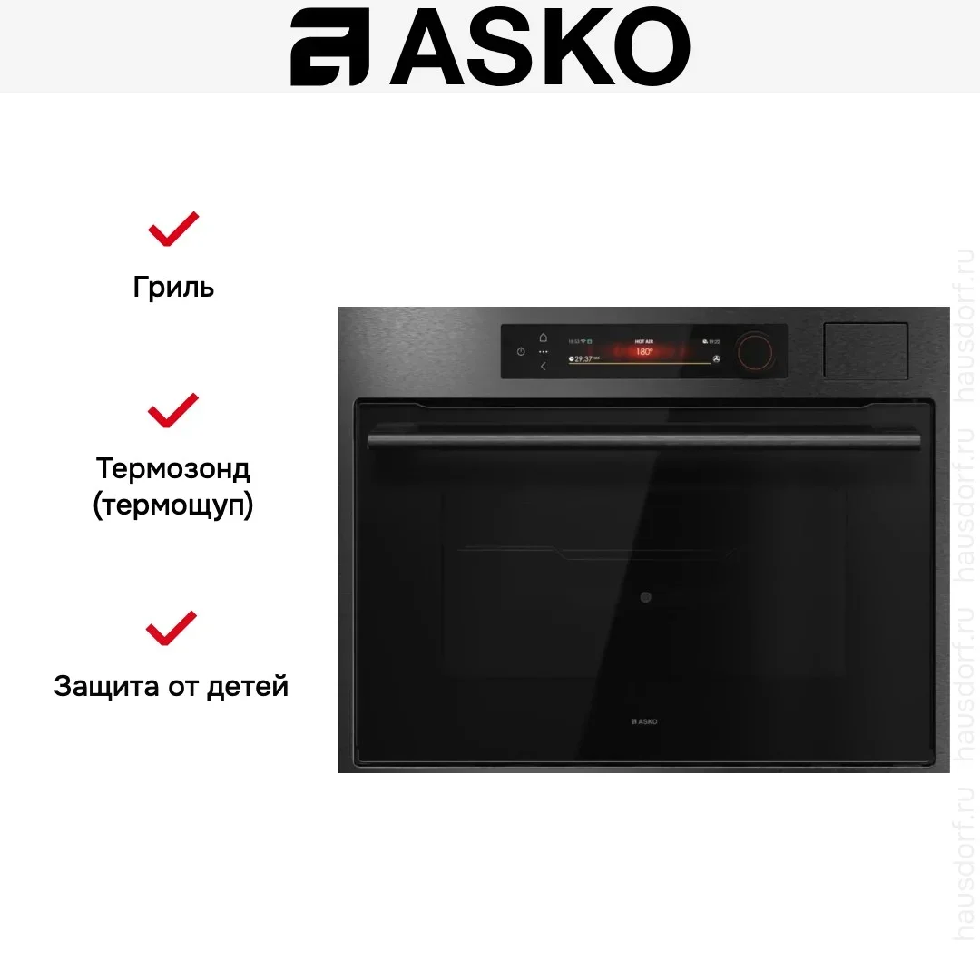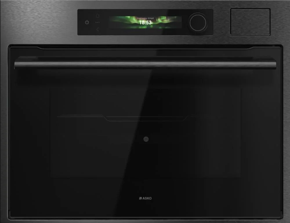 Компактный духовой шкаф ASKO OCS64BSH представляет собой гармоничное сочетание стильного оформления и продуманной функциональности, созданное для тех, кто ценит минимализм и профессиональные результаты при ограниченном пространстве. Корпус в оттенке черной стали и аккуратная рамка NYACraft Frame Series 6 формируют строгий, современный образ, который легко впишется в интерьер любой кухни, при этом передняя панель оснащена откидной дверцей с четырехслойным стеклопакетом, обеспечивающим надежную теплоизоляцию и безопасное использование. Внутреннее пространство обработано стойкой эмалью и вмещает 51 литр, что делает прибор универсальным решением для небольших семей или для дополнительной рабочей зоны; четыре уровня монтажа противней дают свободу при размещении нескольких блюд одновременно, а комплект поставки включает решетку, два противня, термощуп и однолинейные телескопические направляющие, облегчающие извлечение горячих поддонов. Панель управления объединяет сенсорные кнопки TouchControl и поворотные регуляторы с подсветкой, а цветной TFT-дисплей гарантирует удобный выбор параметров и наглядное отображение режимов; управление также доступно через приложение ConnectLife.TRIR, что делает эксплуатацию более гибкой и современной. Среди рабочих режимов — классический верхний и нижний нагрев, изолированный нижний обогрев, и эффективная конвекция, дополняемая функцией аэрогриля и крупной электрической решеткой для равномерного подрумянивания. Паровые программы представлены шестью алгоритмами и возможностью комбинирования горячего воздуха с паром либо верхнего и нижнего нагрева с вентилятором и влажной обработкой, что расширяет кулинарные горизонты: стерилизация, размораживание, медленное сохранение тепла для подачи, подогрев посуды и режим Шаббат. Интегрированный парогенератор Geyser Steam автоматически дозирует количество влаги в соответствии с рецептурой, резервуар на 1,2 литра позволяет готовить серию фирменных блюд без постоянной доливки, а функция «100% пар» и опция комбинированного приготовления с паром обеспечивают мягкую текстуру и сохранение полезных веществ. Для экономного и экологичного использования предусмотрены ECO-режим и класс энергопотребления A++, быстрый разогрев снижает ожидание, а диапазон температур от 30 до 250 °C покрывает все потребности от низкотемпературной томки до интенсивного запекания. Освещение с регулируемой яркостью и цветовой температурой сделано светодиодным и помогает контролировать готовность, а наличие четырехстеклянной дверцы, защиты от детей и возможности уменьшения влажности увеличивают комфорт и безопасность. Гриль большого формата и дополнительные опции типа аэрогриля/аэрофритюр пригодятся для приготовления золотистых корочек без лишнего жира, высокая универсальность поддерживается программой «Шеф» и автоматическими шагами, позволяющими следовать пошаговым алгоритмам. Компактность изделия с габаритами 45×59×56 см и нишей для встраивания 45×56×55 см экономит место, а при транспортировке учитывается размер упаковки 52×64×70 см и длина шнура 200 см. Тщательно продуманная эргономика, удобный хват ручки с логотипом и практичная внутренняя конфигурация делают агрегат удобным в ежедневном пользовании, а наличие регуляторов, дисплея и расширенного набора программ гарантирует, что даже при огра