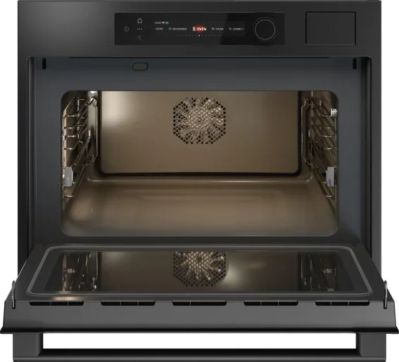 Компактный духовой шкаф ASKO OCSM64GSH — это сочетание продуманного дизайна NYACraft Frame Series 6 в графитовом исполнении и богатого функционала, упакованного в корпус высотой 45.8 см, шириной 59.7 см и глубиной 56.4 см, что делает прибор идеальным решением для встроенной небольшой ниши 45—45.5×56×55 см. Вдохновляющий внешний вид дополняют четырехслойная холодная дверца с фирменной ручкой и аккуратная текстовая панель управления с сенсорными кнопками и поворотными регуляторами с подсветкой, позволяющие легко выбирать нужные параметры. Объем камеры 50 л и четыре уровня приготовления дают простор для многокомпонентных блюд, а эмалированное покрытие упрощает уход; традиционная очистка дополняется функцией удаления накипи для поддержания работоспособности парового модуля. Встроенный парогенератор Geyser Steam формирует оптимальный объем влажности для разных рецептов, обеспечивая полноценное приготовление на 100% пару и расширяя возможности сочного и нежного результата; резервуар объемом 1.2 л удобен в обслуживании. Многообразие режимов — 28 рабочих вариантов и 143 автоматические программы — включает классический верхний/нижний нагрев, отдельный нижний нагрев, конвекцию, консервирование, высушивание, автоматический шеф‑режим и комбинированные методики с паром: горячий воздух+пар, нагрев сверху+снизу+вентилятор+пар, большой гриль с вентилятором, а также специальные программы СВЧ и паровые циклы (по 4 варианта каждого типа), что делает прогнозируемым успех в приготовлении разных кухонь. Наличие функции СВЧ мощностью 1000 Вт и опции Stirrer для микроволнового нагрева без поворотного стола существенно расширяют сценарии использования, а режимы аэрогриля/аэрофритюра и 360°AirFlow гарантируют равномерную корочку и хрустящую текстуру. Для практичности предусмотрены телескопические направляющие (однорівневые) и съемные навесные рейки на четырех позициях, комплект из решетки, двух противней и термощупа позволяет контролировать степень прожарки. Светодиодное освещение камеры с регулировкой яркости и цветовой температуры обеспечивает удобный визуальный контроль, а текстовый дисплей и поддержка приложения ConnectLife.TRIR расширяют возможности дистанционного управления. Прибор рассчитан на стандартное напряжение 220-240 В и частоту 50-60 Гц, оснащен длиной сетевого кабеля 200 см и системой защиты от детей, что повышает безопасность эксплуатации. Эта компактная модель сочетает в себе эстетику и инженерные решения для тех, кто ценит продуманную эргономику, широкий функционал и надежность в ограниченном пространстве.