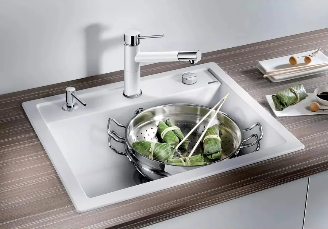 Практическая эксплуатация тоже продумана: глубина чаши снижает разбрызгивание, а прямоугольная форма повышает удобство использования разделочных досок поверх раковины. Ширина и глубина мойки позволяют разместить дополнительные аксессуары, например, сушилку или откидывающуюся доску, без потери функциональности.