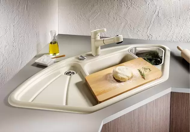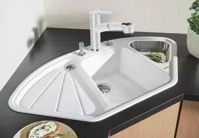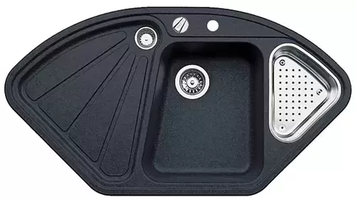 Модель DELTA сочетает функциональность и эстетику угловой мойки. Основная чаша имеет трапециевидную форму. Крыло немного углублено, что позволяет использовать его в качестве дополнительной рабочей зоной. Коландер из нержавеющей стали повторяет форму чаши и служит для мытья и сушки овощей и фруктов. Рельефное крыло оборудовано дополнительным сливом для эффективного удаления излишков жидкости. Закругленные углы упрощают очистку труднодоступных мест.