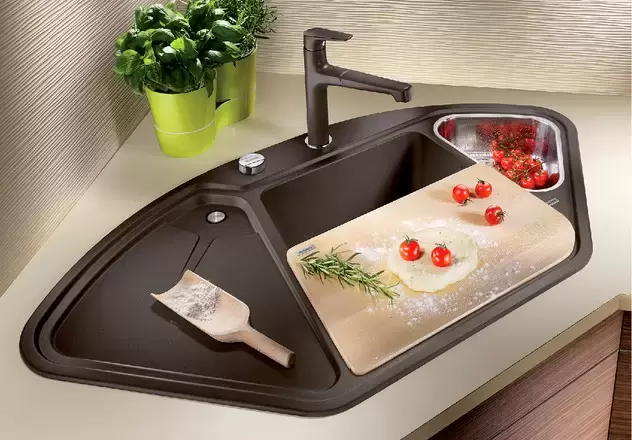 Blanco DELTA II SILGRANIT — практичная угловая мойка из силгранита. Просторное крыло с углубленным донцем может использоваться для высушивания тарелок, а также ополаскивания фруктов, овощей и зелени. Дополнительная чаша модели укомплектована перфорированным коландером из нержавеющей стали.