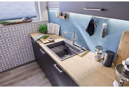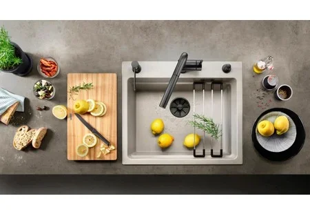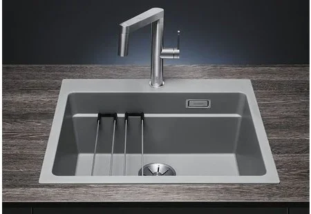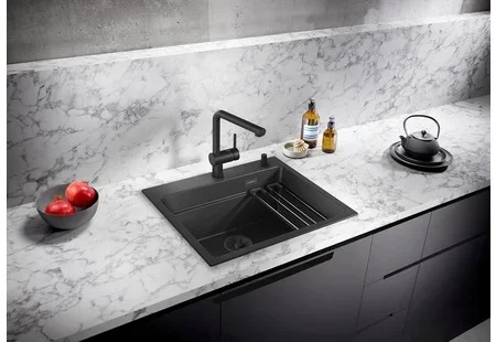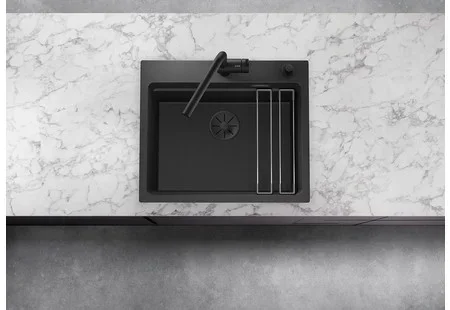 Мойка Blanco Etagon 6 — накладная прямоугольная модель размером 60×51 см оттенка «Антрацит». Компактные габариты делают её универсальной для типовой кухни с тумбой 60 см, а чёткие линии хорошо впишутся в интерьер современной кухни. Поверхность обладает глубокой, насыщенной текстурой цвета, которая маскирует мелкие следы использования и придаёт обстановке благородный вид.