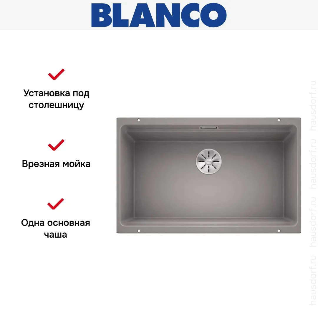 Врезная мойка Blanco — отличный выбор для тех, кто хочет создать гармоничное кухонное пространство с полностью вписывающейся в него сантехникой. Преимущество такой конструкции — плотное прилегание к столешнице, так как вырез подбирается индивидуально под габариты модели. Под стыки не попадает вода, поэтому срок службы значительно увеличивается, пользоваться ей удобно и приятно. Данная модель имеет стандартную форму, поэтому подходит большинству пользователей. Устанавливается под столешницу, благодаря чему не остается стыков, в которых копились бы загрязнения, а также увеличивается рабочая глубина.