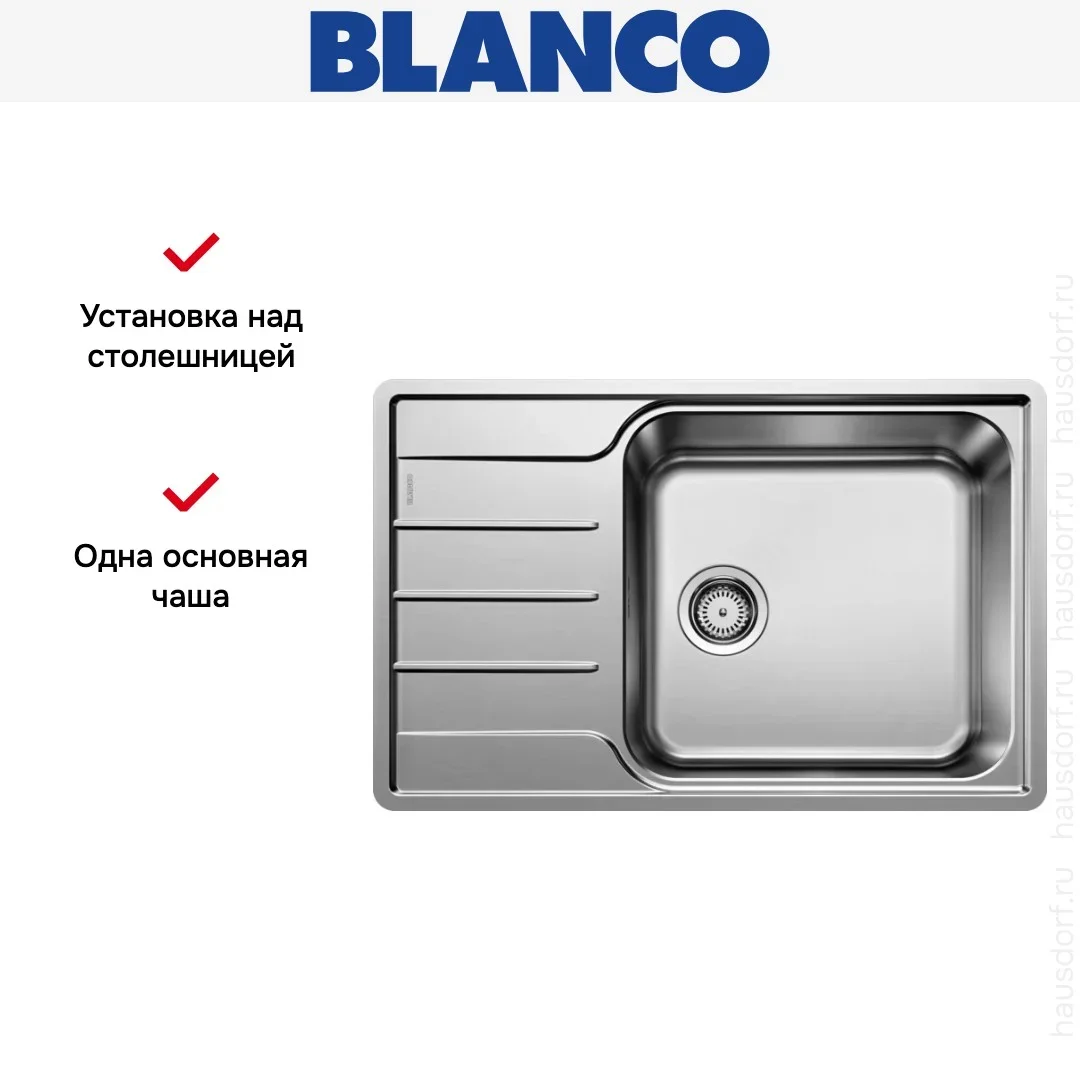 Мойка Blanco Lemis XL 6 S IF Compact — врезная прямоугольная модель с аккуратными габаритами 78×50 см и матовой поверхностью из нержавеющей стали. Она сочетает практичность и строгую эстетичность, подходя к разным стилям кухни.
