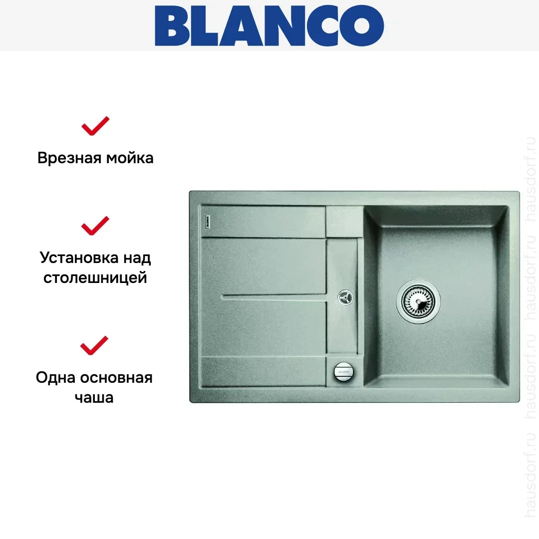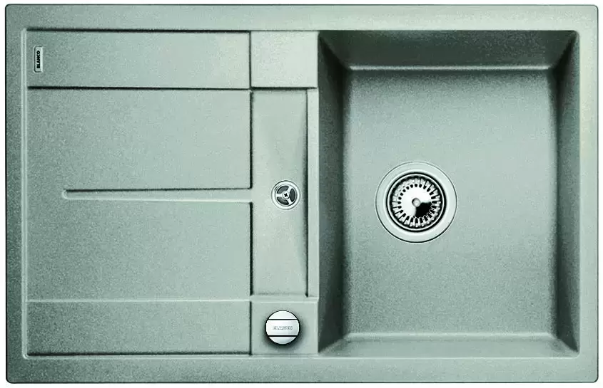Универсальная ширина 78 см позволит устанавливать эту мойку в кухне любой площади. Глубина чаши составляет 19 см. Широкий бортик по краю надежно защитит мебель от брызг. Врезной тип монтажа предусматривает установку над столешницей, но имеется также вариант врезки под столешницу, в том числе в угловую тумбу. Искусственный материал Silgranit™ puradur™ II на 80% состоит из натурального гранита, экологически безопасен и нетоксичен. Плотная непористая структура отталкивает грязь и воду, так что ухаживать за этой мойкой очень легко. Покупателям предлагаются модели десяти приятных сдержанных оттенков от светлого жасминового и жемчужного до темного кофейного и антрацитового. Еще одно преимущество этой модели — оборачиваемая конструкция: крыло может располагаться слева или справа от чаши. Модель комплектуется отводной арматурой 3½" с клапаном-автоматом. Мы предлагаем приобрести дополнительные аксессуары — разделочные доски, металлические корзины, решетки и поддоны.