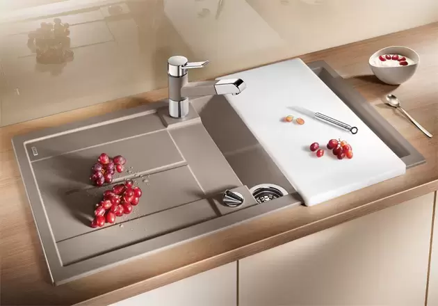 Накладная мойка Blanco — отличный выбор для тех, кто хочет создать гармоничное пространство с удобной сантехникой. простой в установке. Преимущество такой конструкции: легко подобрать практически к любой кухне и не придется демонтировать вместе с тумбой при ремонте или перестановке остальной мебели. Устанавливается над столешницей: это самый простой способ монтажа, зачастую с ним можно справиться даже без специалистов, главное — правильно рассчитать размеры ниши.