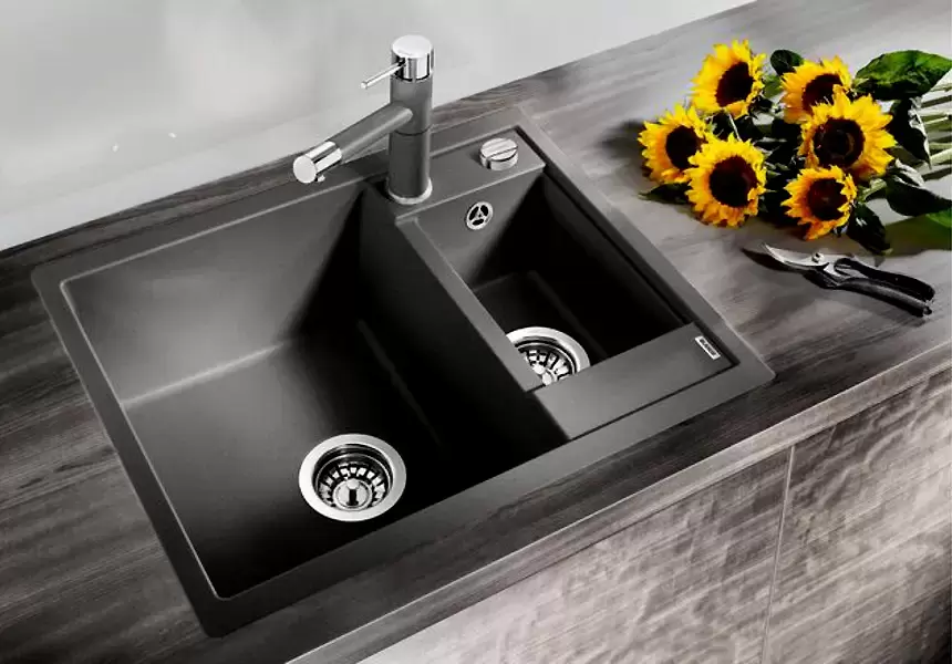 Врезная мойка выглядит аккуратно и стильно. Имеется возможность установки под столешницу, что сделает конструкцию еще более гигиеничной и эффектной. Оборачиваемая конструкция позволяет подстроить расположение чаш под индивидуальные особенности помещения и владельцев. Материал изготовления — искусственный камень Silgranit puradur II, на 80% состоящий из натурального гранита, идеально гладкий, прочный, не изменяющий цвет под действием пищевых красителей. Глубина основной чаши 19 см позволяет мыть посуду большого размера, не опасаясь, что брызги попадут на мебель. Клапан-автомат обеспечивает автоматический отвод воды, что повышает комфорт использования.