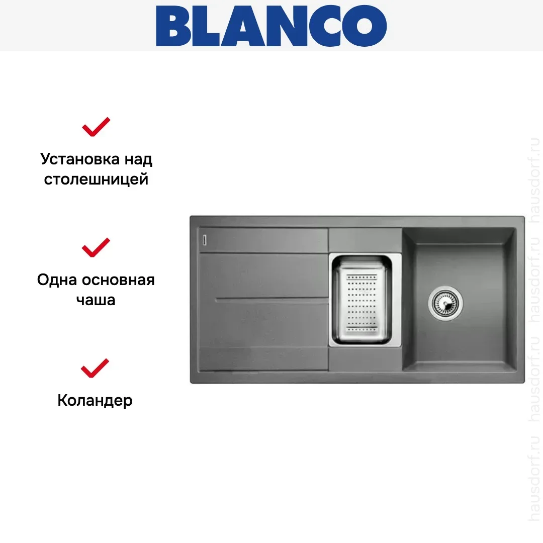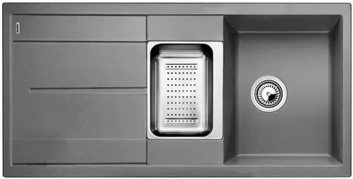 Оборачиваемая модель оборудована дополнительной чашей и коландером из нержавеющей стали. Аксессуар повторяет форму чаши и необходим для мытья столовых приборов или фруктов. Излишки воды стекают через специальные отверстия. В комплект входят также отводная арматура с клапаном-автоматом для основной чаши, позволяющая удобно сливать воду, и корзинчатый вентиль для дополнительной чаши, предупреждающий появление засоров. Большое крыло — дополнительная рабочая зона. Материал Silgranit устойчив к появлению царапин и сколов, легко очищается и является безопасным для продуктов питания.