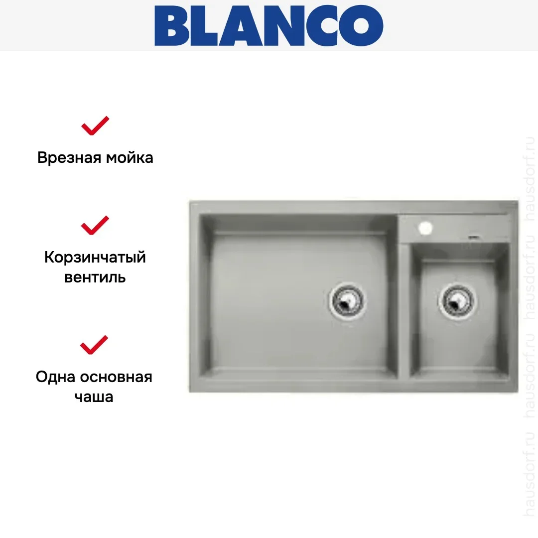 Эффектная кухонная мойка с двумя чашами. Модель из коллекции Blanco Metra подойдет для просторной кухни благодаря ширине 90 см. Универсальный дизайн и прямоугольная форма отлично выглядят в современной или классической кухне. Благодаря скругленным углам в ней не задерживается грязь. Так же универсален набор из 10 цветов — от белого и жасминового до цвета кофе, антрацит и алюметаллик. Мойка оснащена просторной, глубокой основной чашей и функциональной дополнительной чашей для мытья большой посуды или овощей. Широкая площадка позволяет удобно размещать даже несколько дополнительных аксессуаров. Модель изготовлена из запатентованного искусственного камня Silgranit PuraDur II, идеально гладкого и гигиеничного. Материал отличается высокой прочностью, поэтому появление царапин и повреждений исключено. Грязеотталкивающее покрытие гарантирует простоту в уходе. Имеется корзинчатый вентиль, который выполняет фильтрующую функцию, задерживая крупные частицы и не допуская их попадания в канализационную систему. Корзина вентиля легко извлекается, что позволяет без затруднений удалить оставшийся на ней мусор. Возможна установка клапана-автомата с отводной арматурой, который сливает воду путем нажатия кнопки на бортике, так что не нужно пачкать руки. Дополнительно можно приобрести разделочные доски, коландеры и решетки на раковину. Модель допускает установку под столешницу для более удобной очистки.