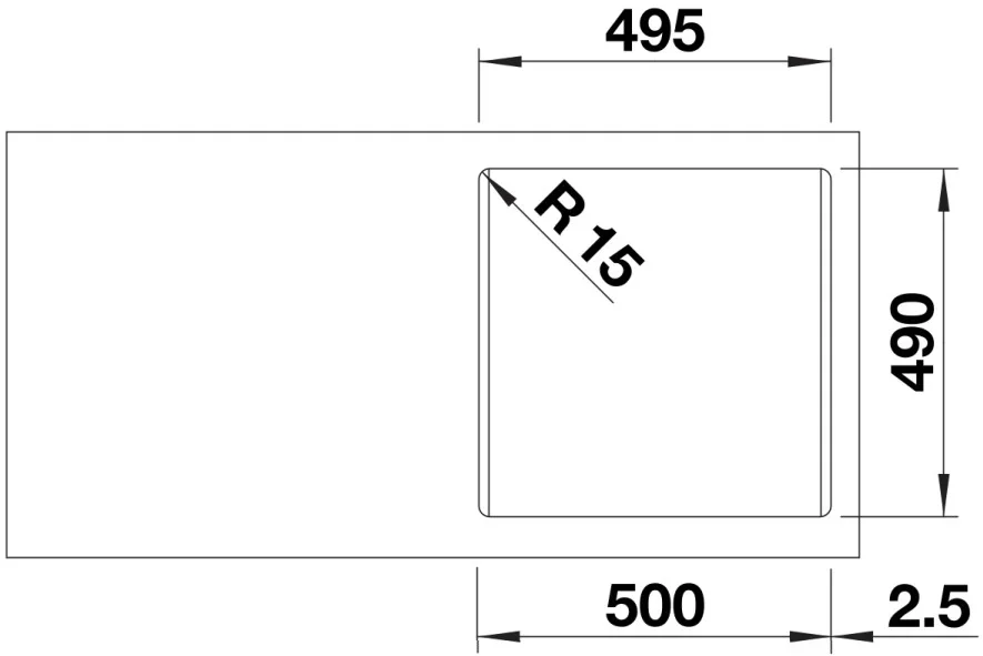 Монтаж предполагается над столешницей с бортиком, что упрощает установку и скрывает кромку выреза. Ширина базы 50 см и размеры монтажного отверстия 49,5×49 см с радиусом скругления шаблона 1,5 см позволяют точно подготовить нишу и избежать лишних доработок при врезке. Необорачиваемая конструкция задаёт единую ориентацию расположения чаши, что стоит учитывать при выборе места под смеситель и аксессуары.