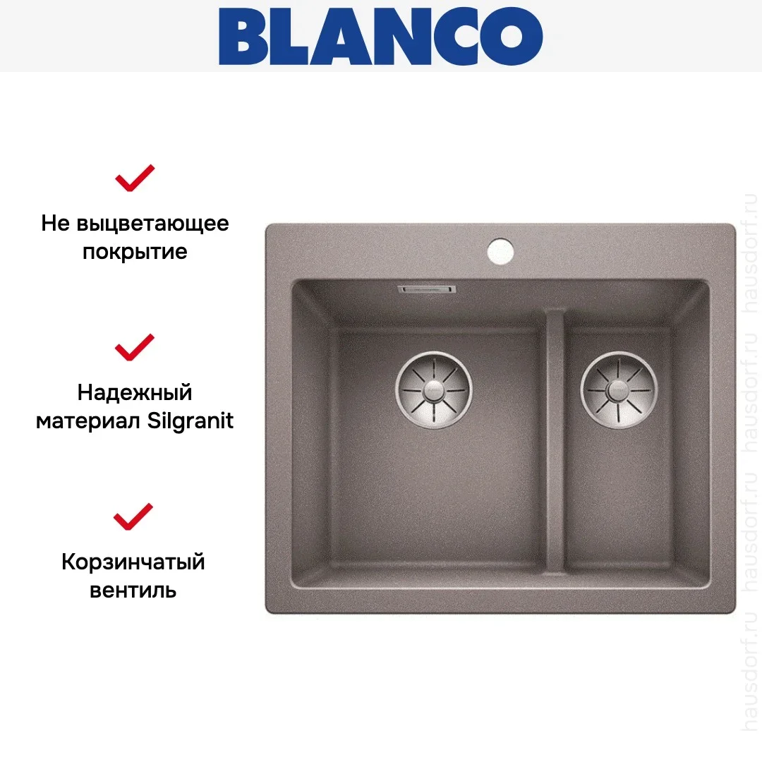 Элегантная мойка Blanco с двумя эргономичными чашами. Гигиеничный перелив C-overflow® и новая отводная арматура InFino™ с двумя корзинчатыми вентилями обеспечивают комфорт в эксплуатации.