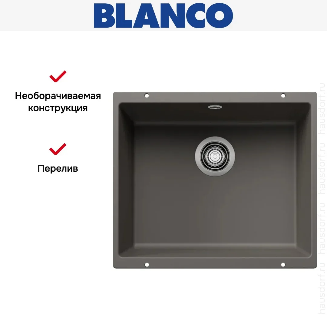 Мойка Blanco Rotan 500-U Silgranit — врезная прямоугольная модель для подстольной установки, выполненная в вулканическом сером цвете. Она рассчитана на шкаф шириной от 60 см и компактно укладывается на рабочую поверхность общей шириной 53 и глубиной 46 см. Монтажное отверстие 50×40 см облегчает точную установку и гарантирует плотную посадку без лишних зазоров. Конструкция не оборачиваемая, поэтому точное расположение сифона и смесителя нужно продумать заранее.