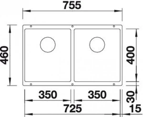 Изделие представляет собой врезную прямоугольную конструкцию для установки под столешницу. Габариты корпуса составляют 75,5×46 см, что делает его оптимальным решением для кухонной тумбы шириной от 80 см. Монтажный вырез под столешницу должен иметь размеры 72,5×40 см с радиусом скругления 1 см, что упрощает точную подгонку и обеспечивает плотное прилегание к кромке. Необорачиваемая схема конструкции означает фиксированную ориентацию при установке, поэтому планирование расположения чаш и смесителя нужно выполнить заранее.