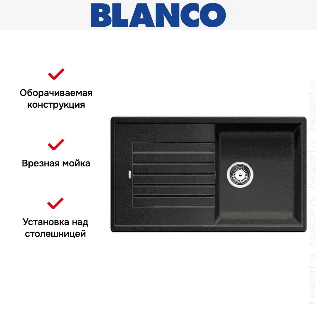 Blanco Zia 5 S — гранитная мойка оборачиваемой конструкции. Модель укомплектована отводной арматурой с корзинчатым вентилем, обеспечивающим защиту от образования засоров.