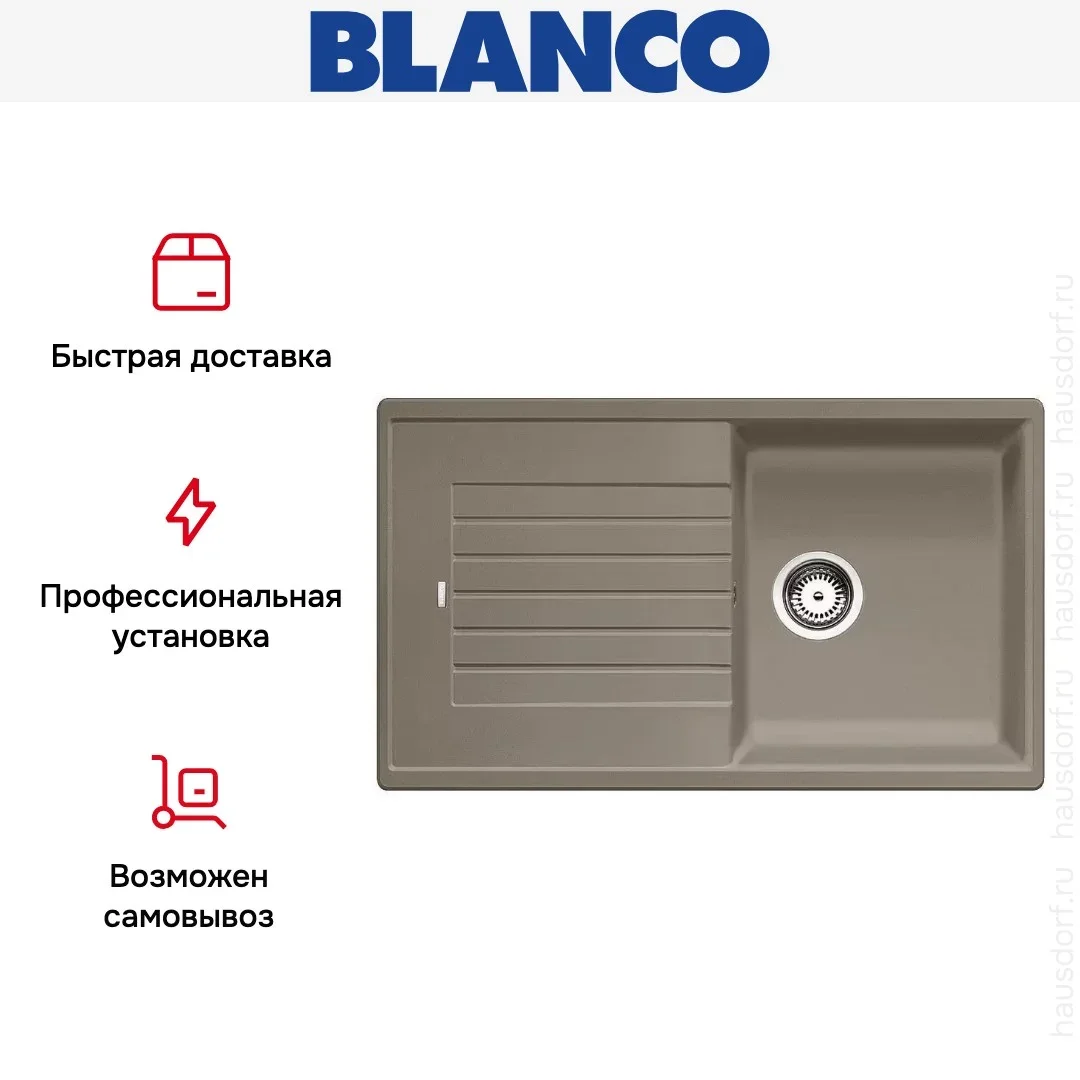 Blanco Zia 5 S — гранитная мойка оборачиваемой конструкции. Модель укомплектована отводной арматурой с корзинчатым вентилем, обеспечивающим защиту от образования засоров.