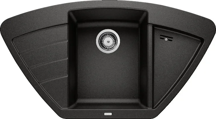 Мойка Blanco Zia 9 E чёрный — накладная угловая модель размером 93×51 см, созданная для рациональной организации рабочей зоны. Модель устанавливается над столешницей и идеально вписывается в угол, экономя полезную площадь и делая кухню удобнее. Ширина базы 90 см и параметры монтажного отверстия 90×60×42.5 см позволяют точно подобрать шкаф, подходящий для установки.