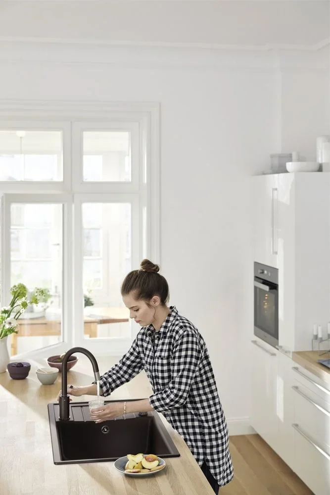 Silgranit — композитный материал на основе натуральных минеральных наполнителей и полимерных связующих. Он стойко противостоит царапинам, ударным нагрузкам и экстремальным температурам. Материал непористый, поэтому грязь и налет не въедаются, а чистка занимает минимум времени. Черная отделка хорошо скрывает следы от воды и мелкие дефекты, что сохраняет аккуратный вид надолго.