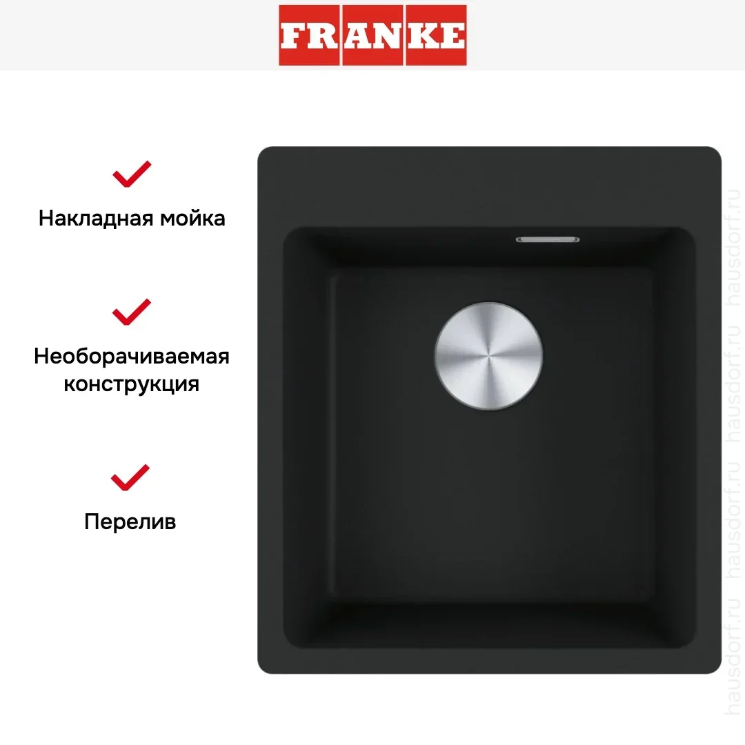 Мойка Franke MRG 610-39 FTL черного матового цвета — стильная врезная модель, сочетающая в себе глубину цвета, функциональность и современный дизайн. Прямоугольная форма с габаритами 44×50 см обеспечивает вместительную чашу глубиной до 50 см, что гарантирует комфорт при мытье посуды и эффективно предотвращает разбрызгивание воды. Такие параметры делают изделие особенно практичным даже при интенсивной эксплуатации.