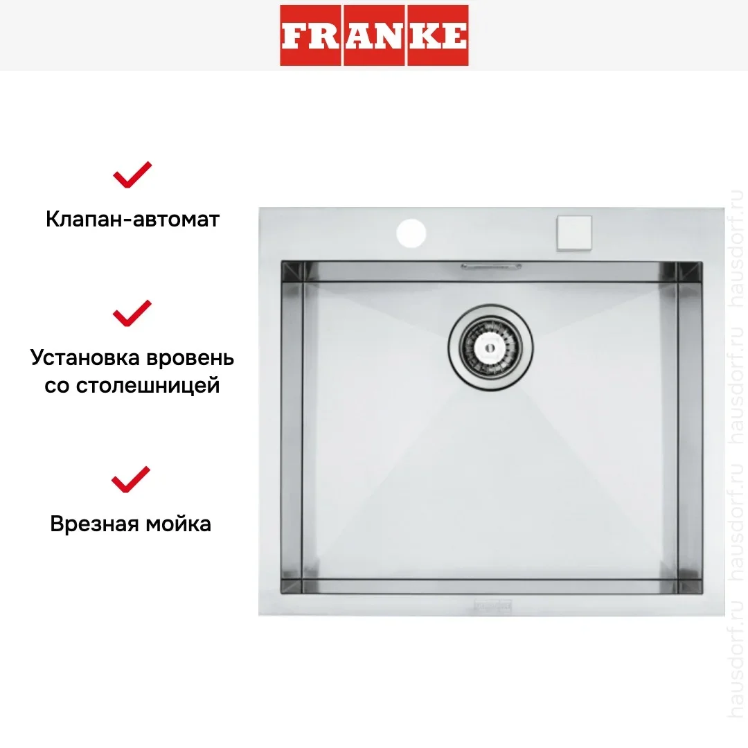Врезная мойка Franke — отличный выбор для тех, кто хочет создать гармоничное кухонное пространство с полностью вписывающейся в него сантехникой. Преимущество такой конструкции — плотное прилегание к столешнице, так как вырез подбирается индивидуально под габариты модели. Под стыки не попадает вода, поэтому срок службы значительно увеличивается, пользоваться ей удобно и приятно. Данная модель имеет стандартную форму, поэтому подходит большинству пользователей. Устанавливается вровень со столешницей, благодаря чему не остается стыков, в которых копились бы загрязнения.