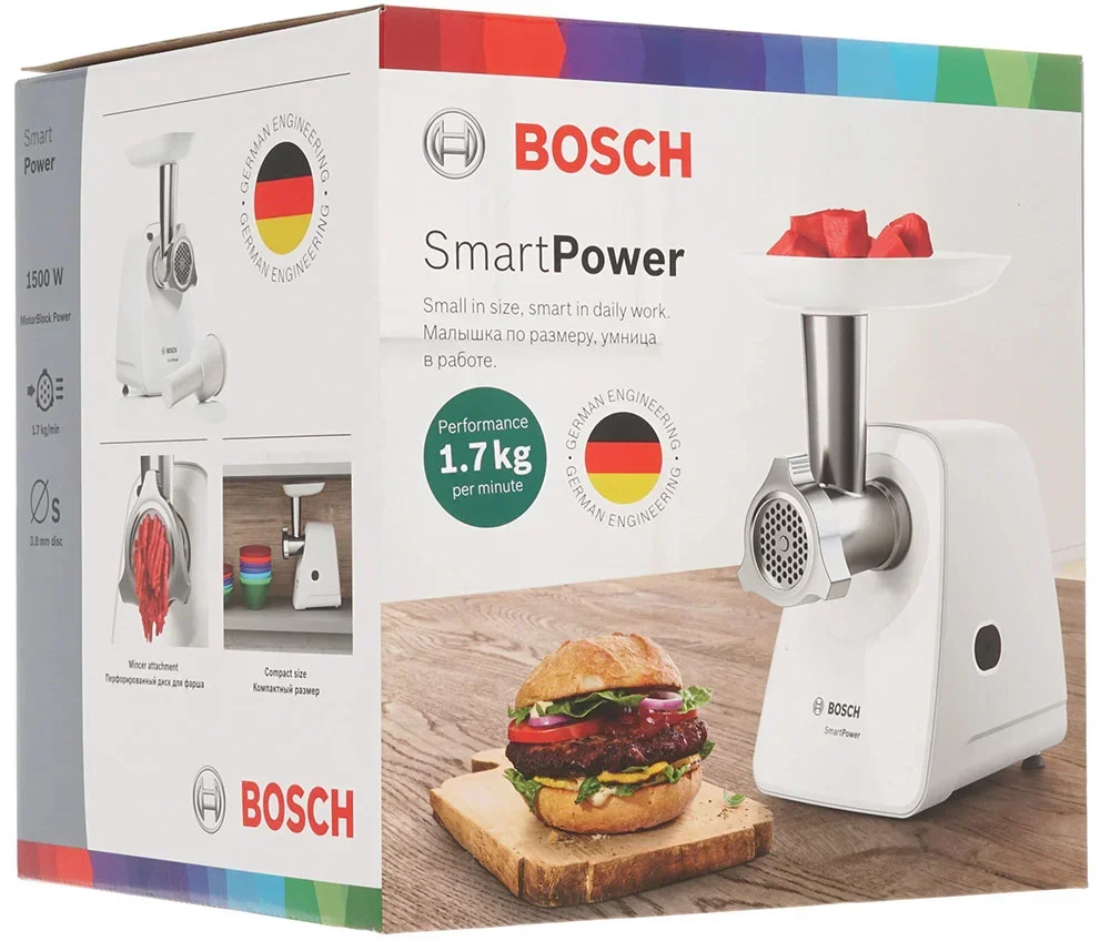 Мясорубка Bosch MFW2500W — это лёгкий и функциональный кухонный помощник, разработанный для тех, кто ищет простое, надёжное и компактное решение для повседневной переработки продуктов. Стационарная модель обеспечивает стабильную производительность на уровне 1,7 килограмма в минуту, что делает её идеальной для приготовления фарша, овощных смесей, начинок для пирогов или домашних колбасок в условиях небольшой семьи, дачи или компактной городской кухни.