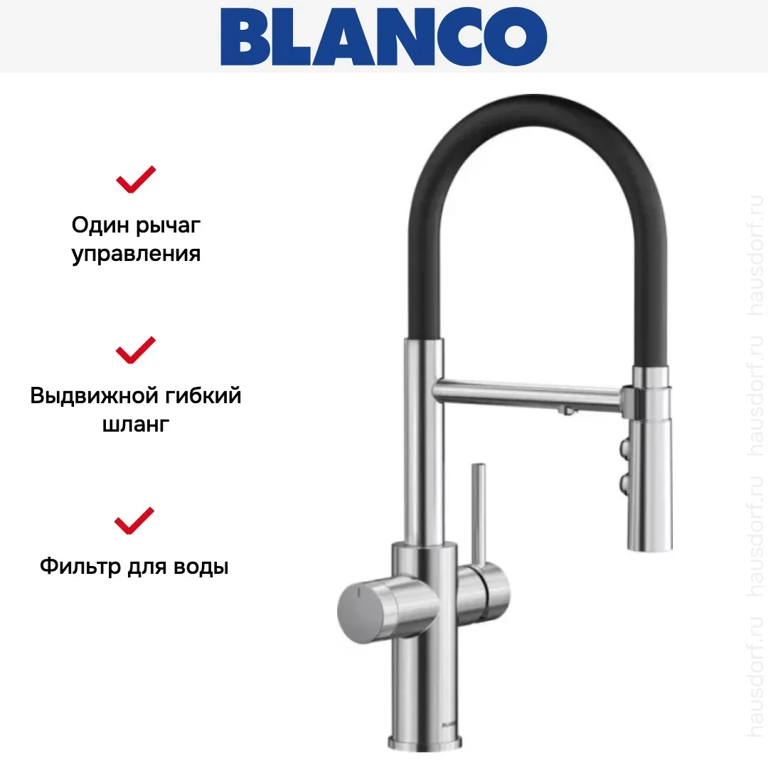 Смеситель Blanco Catris S Flexo Filter сочетает в себе лаконичный внешний вид и продуманные технические решения. Его оттенок нержавеющей стали придаёт кухне современный и нейтральный характер, который гармонирует с большинством рабочих поверхностей и бытовой техники. Корпус из латуни обеспечивает надёжность и стойкость к коррозии, а матовая или полированная поверхность легко очищается от отпечатков и водных следов. Однорычажная конструкция делает управление интуитивным и быстрым, что особенно ценно в условиях частого приготовления пищи.