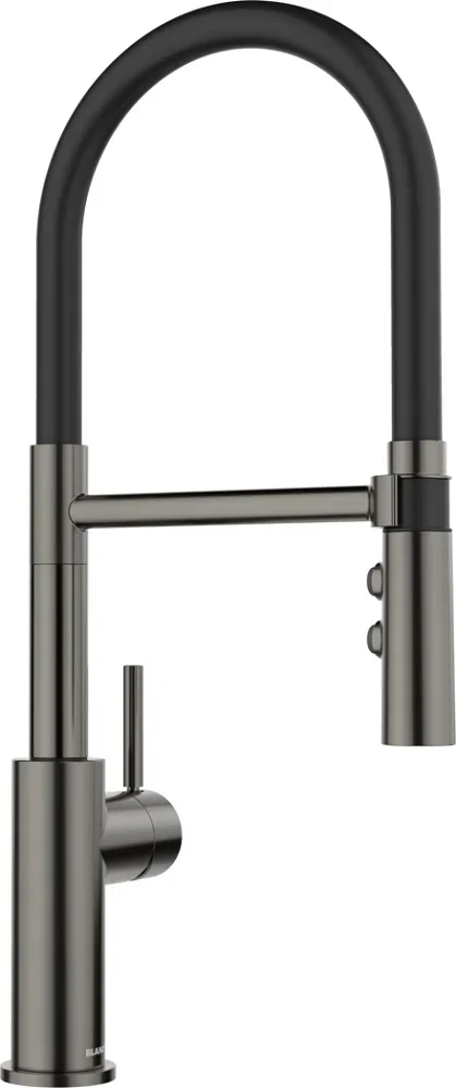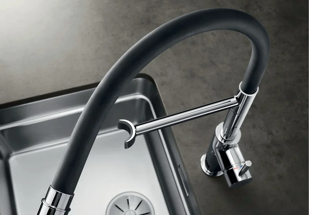 Смеситель Blanco Catris S Flexo Dark Steel сочетает современную эстетику и продуманные инженерные решения для повседневного комфорта. Его тёмный полированный корпус из нержавеющей стали выглядит стильно и создает акцент в кухонном пространстве. Глубокий оттенок «черная сталь» гармонирует с разными фасадами и рабочими поверхностями, добавляя интерьеру благородства. Отделка полированием придаёт изделию легкий блеск, который подчеркивает контуры и делает дизайн выразительным.