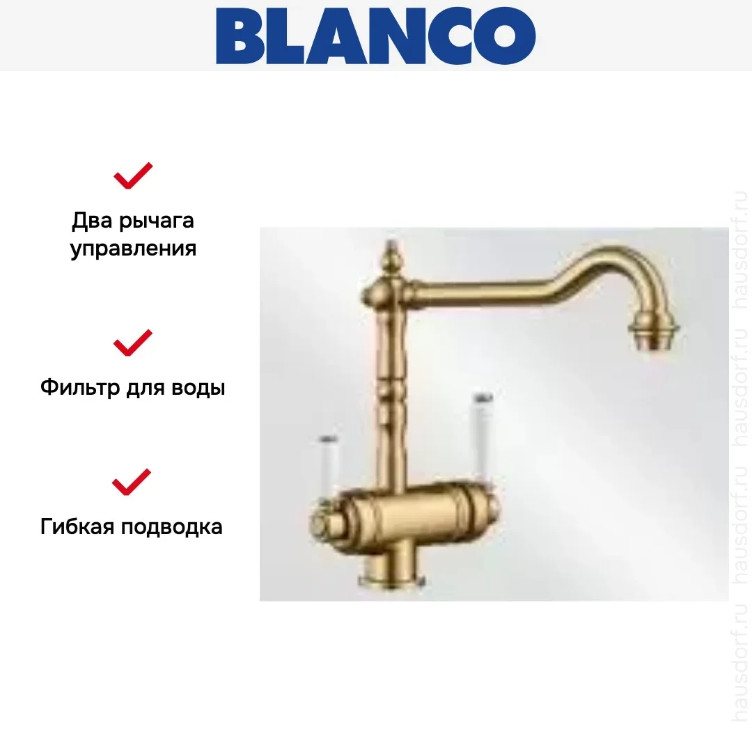 Смеситель SORA — изысканная модель от Blanco. Классический дизайн подходит для интерьеров в стиле ретро или кантри. Модель сочетает элегантные формы и широкий функционал. К изделию можно подключить фильтр, для которого предусмотрен отдельный рычаг управления. Ручки обладают плавным ходом для комфортной и точной регулировки мощности потока. Хромированная поверхность устойчива к высоким температурам, не боится известкового налета и коррозии.