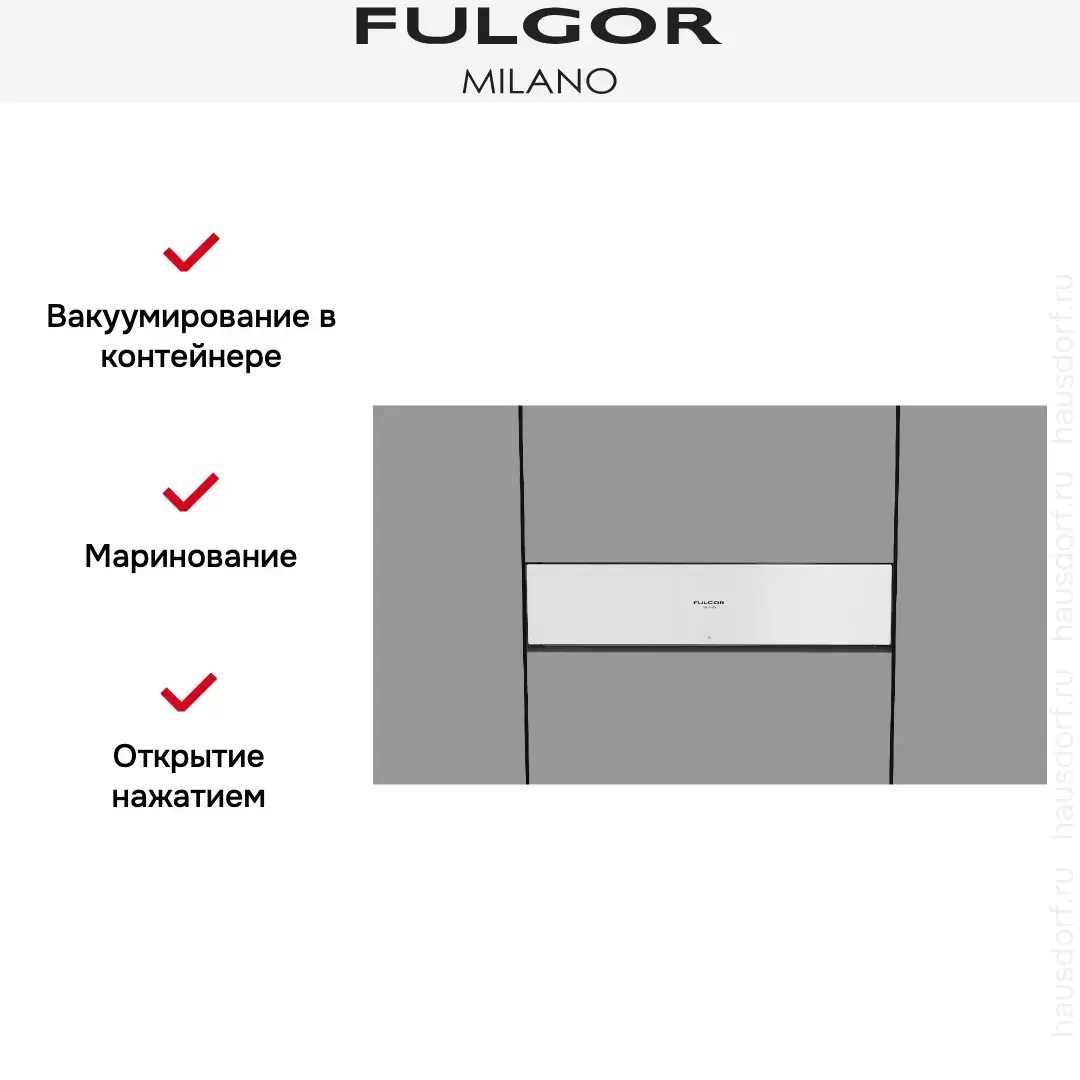 Цвет данной модели — белое стекло — позволяет интегрировать ее практически в любой интерьер. Установите вакуумный упаковщик в одну нишу с духовкой или в колонну с другим прибором. Благодаря современному электронному управлению можно быстро выбрать необходимый режим и проверить, как продвигается цикл. Доступ к содержимому камеры легко получить, просто нажав на фронтальную панель.