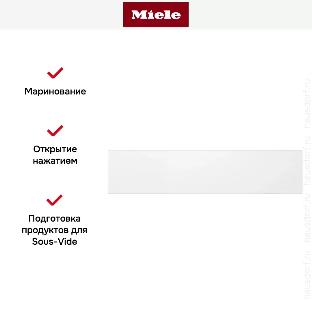 Прибор встраивается в кухонный гарнитур и может быть установлен прямо под духовым шкафом, создавая единый комплект. Лаконичный дизайн не нарушит дизайн интерьера и впишется в любое цветовое решение. Внутренняя камера из нержавеющей стали отличается высоким качеством и устойчивостью к появлению коррозии. Открытие прибора осуществляется при помощи нажатия, ручки отсутствуют. Телескопические направляющие обеспечивают легкое выдвижение даже полностью заполненной полки. Прибор позволяет сохранить свежие овощи и фрукты, а также сделать заготовку для приготовления в пароварке или духовом шкафу и многое другое.