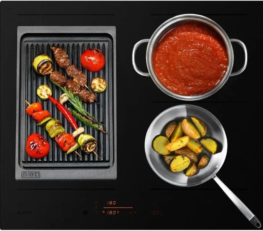Панель управления расположена спереди и реализована через сенсорный слайдер TouchSlider с цифровым дисплеем. Это обеспечивает интуитивное управление мощностью и быструю регулировку в 12 шагов. Для каждой зоны предусмотрен собственный таймер с функцией отключения и звуковым сигналом, что делает приготовление многозадачным и безопасным. Режим Stop&Go позволяет временно приостановить процесс готовки, не сбрасывая заданные параметры, что удобно при неожиданных перерывах.