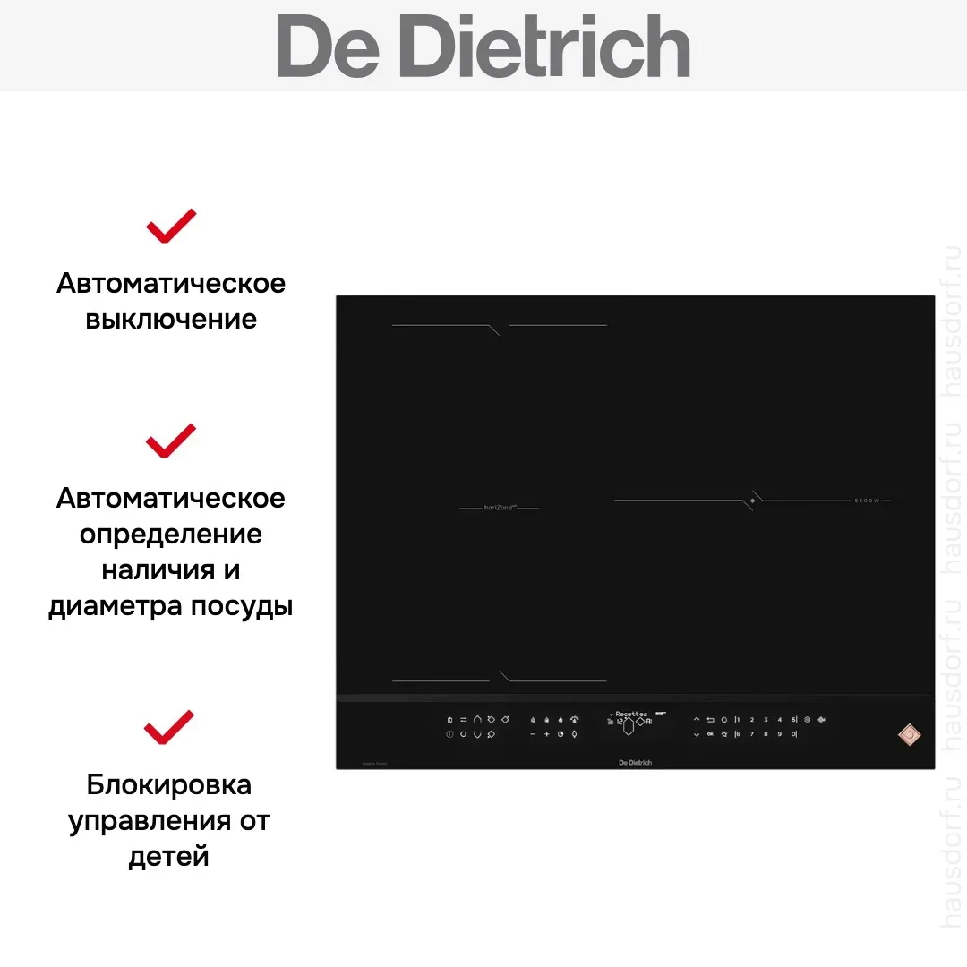 Варочная панель De Dietrich DPI4332HP — это изысканное индукционное устройство из коллекции Philharmonie, воплощающее в себе французский шик, инженерную точность и передовые технологии. Модель выполнена в глубоком чёрном цвете, что придаёт ей универсальную элегантность и позволяет легко вписать её в любые интерьерные решения — от классики до современного минимализма. Благодаря независимой установке и электрическому подключению панель функционирует автономно, обеспечивая мгновенный, точный и энергоэффективный нагрев. Её компактные размеры — 6 см в высоту, 65 см в ширину и 51,5 см в глубину — позволяют легко встроить изделие в стандартную нишу размером 56×49 см, не нарушая гармонии кухонного пространства. Управление осуществляется с помощью электронной сенсорной системы TouchControl с фронтальным расположением элементов и цифровым дисплеем, на котором отображаются все параметры работы. Это обеспечивает интуитивно понятную настройку зон нагрева и упрощает уход за поверхностью. Каждая конфорка оснащена индивидуальным таймером с возможностью установки от 1 до 99 минут, что позволяет одновременно контролировать несколько блюд без риска их перегрева. Индикатор остаточного тепла визуально предупреждает о том, что поверхность горячая, после выключения прибора, что повышает безопасность эксплуатации. Индукционная технология нагревает только дно посуды, оставляя окружающую зону прохладной. Это не только снижает риск ожогов, но и способствует значительной экономии электроэнергии. Высокая мощность, равномерное распределение тепла и продуманная эргономика делают эту модель идеальной как для повседневной готовки, так и для приготовления изысканных блюд. Панель сочетает в себе премиальное качество сборки, инновационные функции и безупречный внешний вид, подчёркивая высокий вкус владельца и его стремление к комфорту, стилю и совершенству на кухне.