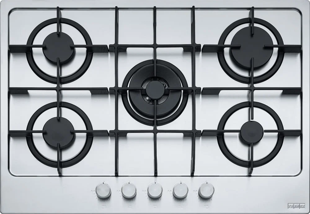 Выбор газовой варочной панели чаще всего обусловлен тем, что в частный дом или квартиру проведен именно газ в качестве обогрева. Работать с этой моделью довольно просто, так как мощность нагрева видна невооруженным взглядом — по силе огня в горелке. Количество конфорок в этой модели: 5. Горелки с двойной короной позволяют увеличивать мощность нагрева в зависимости от диаметра посуды.